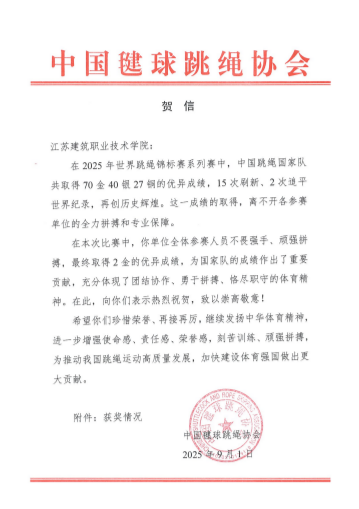 近日,我校收到来自中国毽球跳绳协会的贺信,祝贺我校学生在2025年世界跳绳锦标赛系列赛上所取得的突出成绩,以及新宝gg多年来致力于跳绳运动的开展所作出的积极贡献。希望我校再接再厉,继续发扬中华体育精神,刻苦训练、顽强拼搏,为推动我国跳绳运动高质量发展,加快建设体育强国做出更大贡献。